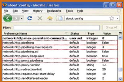 - ستنقلك هذه الكلمة إلي جزء آخر داخل الصفحة، فابحث في هذا الجزء عن كلمة network.http.pipelining. ولاحظ أن الكلمات في الصفحة مرتبة ترتيبا أبجديا.